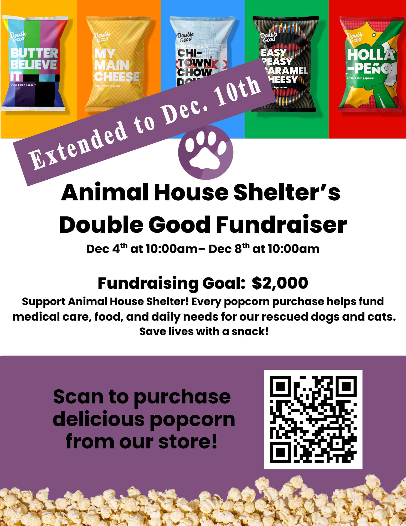 Double Good Popcorn Fundraiser Dec. 4th – Dec. 10th Past Events Where:On-line Days & Times:Dec. 4th – Dec. 10thBegins and Ends at 10am Info:Support Animal House Shelter! Every popcorn purchase helps fund medical care, food, and daily needs of our rescued dogs and cats. Save lives with a snack! Click here to see the Double Good catalog and place an order Click here for the popcorn flavors available, and to place an order.